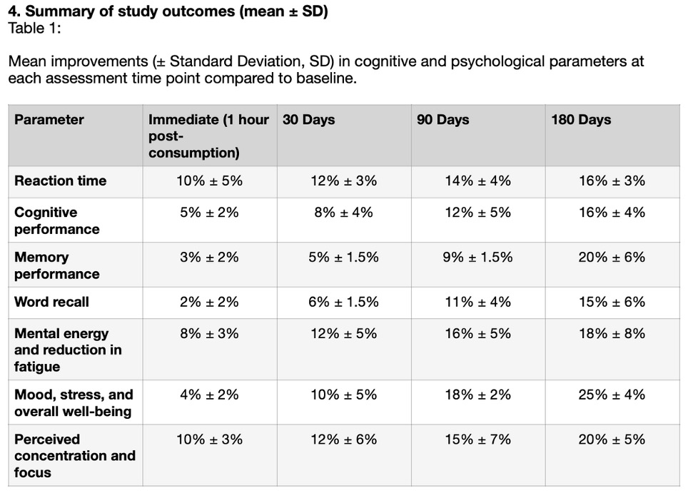 Analyse af resultaterne fra det kliniske forsøg viste statistiske signifikante forbedringer sammenlignet med baseline på tværs af flere kognitive domæner. Særligt sås der forbedringer i reaktionstid, overordnet kognitiv præstationsscore, hukommelse og ordgenkaldelsesevner, alle vigtige egenskaber for et aktivt liv. Deltagerne rapporterede desuden om forbedret mental energi, bedre humør og forbedrede koncentrationsniveauer.